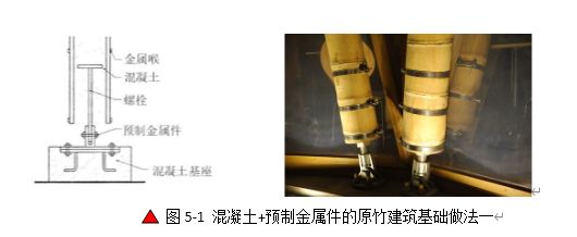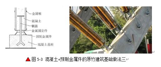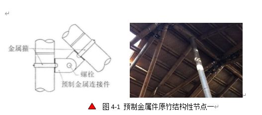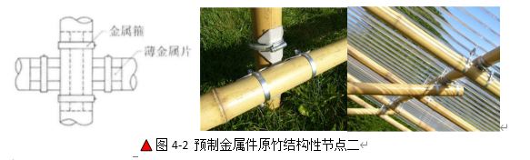 随着人们对金属的发现和利用,简单的金属连接件也逐渐开始在原竹建筑上进行应用。目前来看,由于简易金属连接件能够在造价和结构效果上取得较好的平衡性,所以这种连接方式也是近现代以来原竹建筑节点构造中应用最的方式之一。
