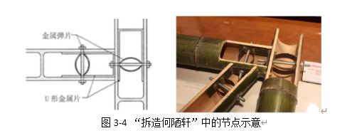 如图3-4所示,建筑师王澍在中国美院“拆解何陋轩”的课程教学中,带领学生们尝试了一种与上文类似的节点做法。其具体做法为利用U形的铁片制作成符合原竹内壁尺寸的形态,其中对称的两边紧贴原竹内壁,并用螺栓对穿固定。另一边则主要作为与另一根原竹连接的固定点,同样采用螺栓连接,这种做法有效地避免了上文中说到的连接问题。此外图中所示的两片具有一定弹性的金属片也在一定程度上保证了由于螺栓连接带来的挤压问题。但这种做法的问题在于,由于没有图3-3中所示的端部固定件,两根原竹仅仅在螺栓的固定下容易发生转动。