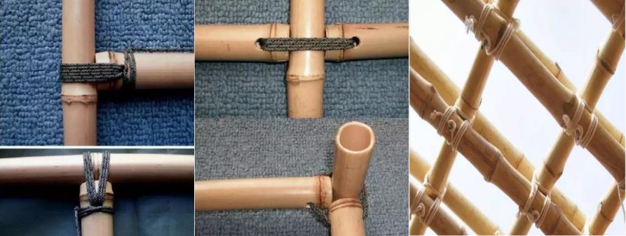 图1-1来自著名原竹建筑师Oscar Hidalgo所总结的几种原竹绑扎方式,主要来自于传统竹脚手架。对于呈90°正交的两根原竹而言,其绑扎方式较为简单,首先在竖向的原竹竹秆上缠绕两到三圈后打结固定,随后以彼此交叉的方式穿过竖向的原竹竹秆和横向的原竹竹秆,并缠绕两到三圈,最后在横向的原竹竹秆上打结固定,对于非90°正交的两根原竹来说,需要采用正交十字式的绑扎方式,其缠绕的圈数不仅要保证结构强度,还要保证完全固定的两根原竹竹秆所成的角度不变形。