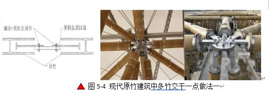 采用预制金属件和混凝土结合的方式的成熟使得多根原竹相交于一点的构造做法也有了新的进展。其主要结构节点为了满足其空间结构的杆件分布特点,都 采用的是多根原竹交于一点的做法,如图5-4,在该建筑节点中,中心连接体为事先预制好的圆形金属盘,上面均布有若干个孔洞。一端为半圆形的金属条作为原竹预制件和中心连接体连接的材料。原竹中灌入混凝土并将半圆形的金属条与混凝土固定,在外部绑上金属喉,待混凝土终凝完成后即可运往工地进行现场拼接。