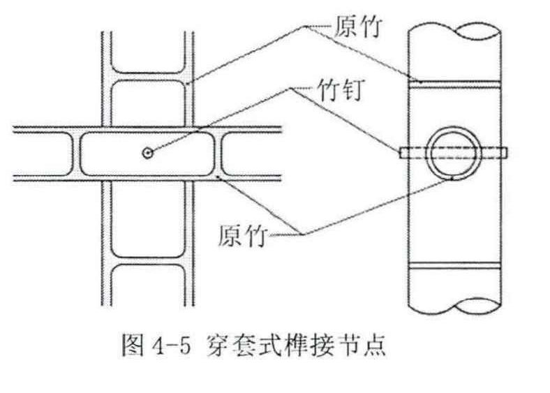 采用绑扎和榫接结合的方式制作原竹建筑结构性节点是对单纯的绑扎节点进行的改良,其构造原理主要来自对于木结构榫卯节点为的模仿和传承。与木结构常用的榫卯节点不同的是由于原竹材料本身的特性,以及加工的难度,单纯的构件穿插和相互固定并不能保证节点的牢固性,通宵需要借助竹钉、木楔等辅助固定件以及棕绳或铁丝等绑扎件对节点进行加强固定。在这种连接方式 中,连接体和辅助连接体可以看作竹钉、木楔与铁丝、棕绳的绑扎物的结合,其基本受力原理为利用原竹的顺纹抗压、抗剪能力和竹钉、棕绳等连接件的抗拉能力承受和抵抗各种外力。