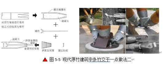 图5-5展示的是另一种处理多根原竹相交于一点的方式,其目的在于利用更小的中心连接体来连接更多数量的原竹。具体做法为首先利用工具对原竹进行端部的砍削等处理后,在原竹端部灌入混凝土并插入螺杆或钢筋,随后用一个具有伸缩性的弹簧金属预制件收紧原竹端部,使其能够更好地与金属盖相结合。待混凝土终凝结束后,单个预制件便制作完,随后利用球形或圆柱形的中心连接件进行组装即可。这种做法的优势在于能够减小中心连接件的尺寸,同时连接更多根原竹。且由于原竹端部进行砍削并用弹簧金属预制件进行固定,很好地起到了统一材料规格的作用,此外,金属盖及弹簧金属预制件在于用于建筑基础构造时,具有一定的防水、防潮的作用。