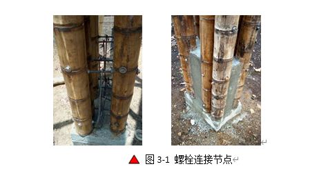 1)、这种连接方式对原竹顺纹抗剪、抗劈裂性能要求高,在使用一后,常常在钻出的孔洞周围发现原竹出现顺纹的裂痕;