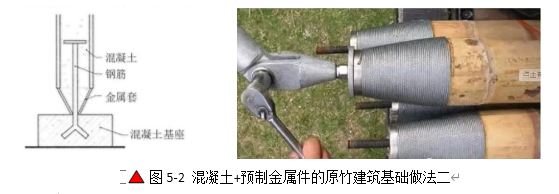 图5-2底部有锥形金属件,用于在节点制作初期灌注混凝土时作为混凝土的加长模板,防止由于竹节的存在而导致混凝土灌注量的不足,在节点制作完成后也相当于一个保护构件。