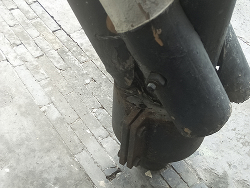 ②另一种方法就是钢构件连接。在何陋轩中,这种方法多用于接近基地部分几根竹的固定连接。此节点处由锚栓、螺帽、金属垫圈、橡胶垫片等配合紧固。该处的支撑原竹一端直插与地面连接的金属杯口,并用水泥砂浆灌注(如图2)。这种钢构件装配式节点连接牢固,同时具有防虫、抗水、抗劈裂等优点。
