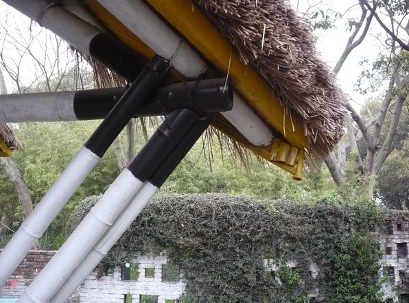因为竹子为空心结构,中空而尖削度大,不易加工,防火较难处理,节点连接刚度难于保证,柱网中的每根竹子上均涂上了黑白相间的颜色的漆,在竹子相连接的地方也就是节点的部分全部涂上了黑色,其余部分全为白色,这样就让人能一下清楚地看出整个何陋轩的柱网的节点构造,十分清晰。