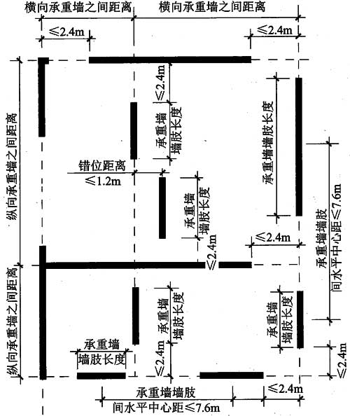 (2)同一轴线上墙段的水平中心距不应大于7.6m;