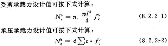 - 螺栓(自攻螺钉)的抗剪承载力设计值,应取螺栓(自攻螺钉)的受剪承载力和承压承载力设计值、每一剪面的承载力设计值的较小值。螺栓(自攻螺钉)的受剪承载力和承压承载力设计值可分别根据本规程公式(8.2.2-1)和公式(8.2.2-2)计算。