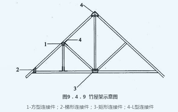9.4.7 人字型屋架可采用竹屋架,弦杆与腹杆都可采用圆竹。竹屋架宜采用三角形桁架。异型屋架宜采用竹屋架与木屋架的混合结构。