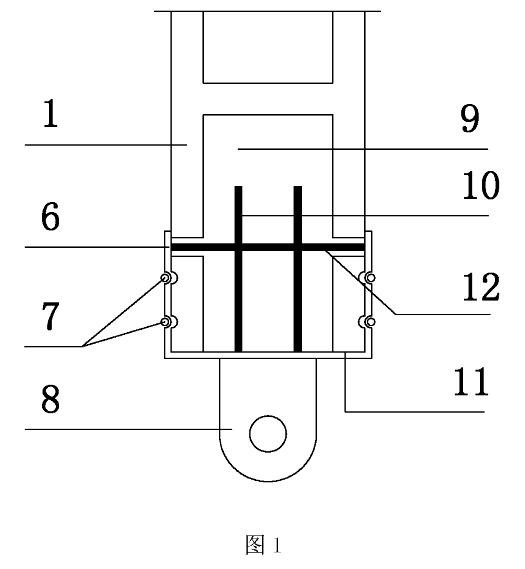 在竹竿1的两端分别安装竹竿连接件2的方法是首先将十字加强筋12插入在竹竿1的端部的十字孔内,然后将多根预埋钢筋10沿轴向插入在竹竿1端部自然成型的空腔内并在空腔内灌注混凝土,混凝土凝固后形成混凝土灌芯9,接下来将钢套箍6套装在竹竿1的端部外周圆面上,并将端板11的外周圆焊接在钢套箍7的外端边缘上,之后将竹竿连接端8的后端固定在端板11的外表面中心,最后将箍筋7缠绕在钢套箍6的外圆周面上而将钢套箍6和竹竿1箍紧。