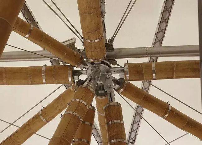 (4):安全性高:竹构件端内部灌注混凝土、外部设钢套箍及箍筋,有效地加强了构件端部的可靠性。