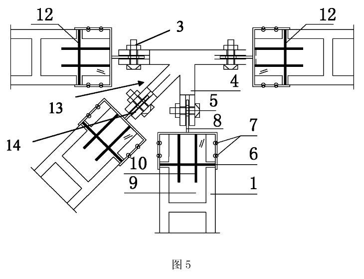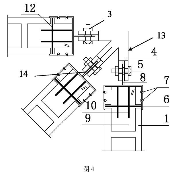 图5为竹结构连接节点中四根竹竿与竹竿连接件连接部位结构示意图。