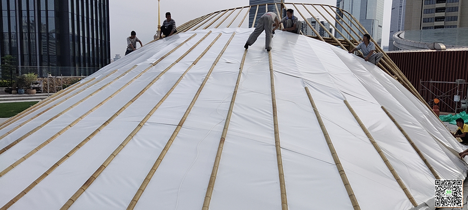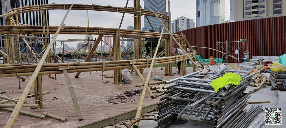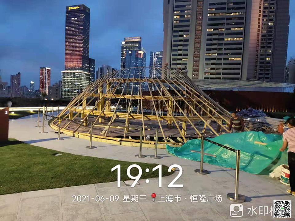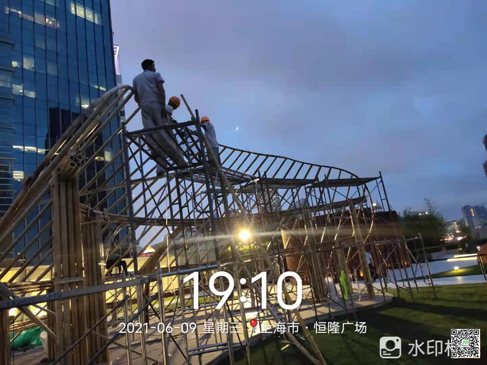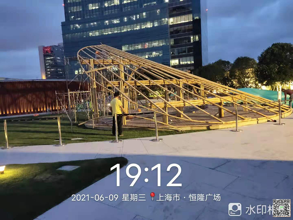 上海恒隆广场坐落于静安区最繁华地段,同时在2005年被中国步行商业街工作委员会评选为〝全国10大著名商业街〞之一,上海境道原竹建筑设计工程有限公司与上海恒隆广场购物中心达成合作,在恒隆广场五楼顶层建造一座高端特色竹棚建筑。上海境道原竹主要负债深化施工,项目还在有条不紊的施工中。