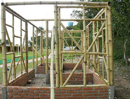 当前社会采用的是比较先进的竹材重组技术,将原竹重组成各种高强度方材和型材,用于高档房屋的建造。竹材在建筑行业的应用研究主要有包括以下几方面:基柱、建筑推架、脚手架、地面活动材料、屋面材料、墙壁、桁架、室内环境装饰、竹水管、竹筋混凝土等。作为一种非常廉价的建筑材料,房屋直接用竹材搭建的,会选择较粗的竹秆或竹秆束作为自己房屋的梁、檩、柱、椽等承重材料。