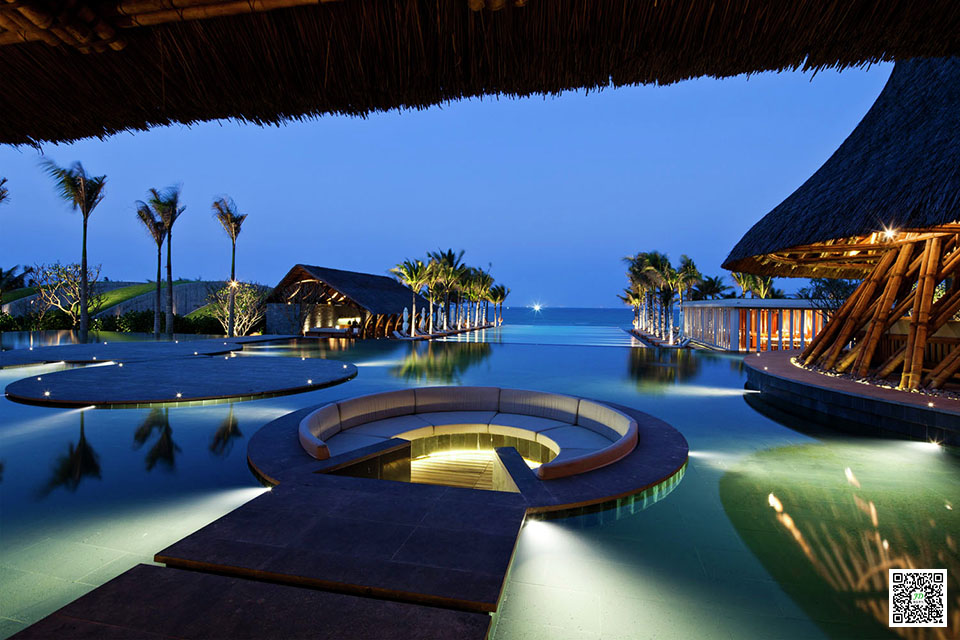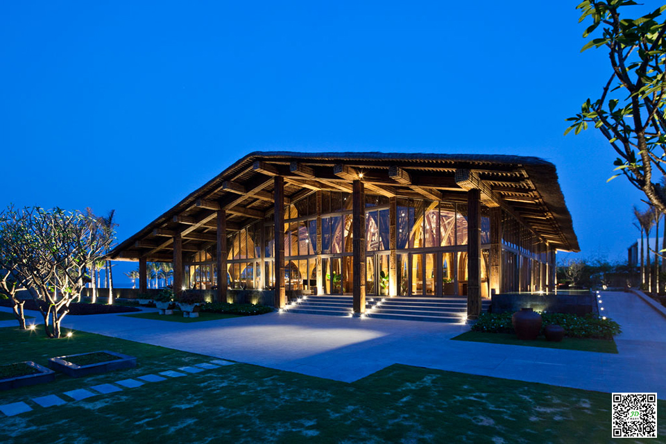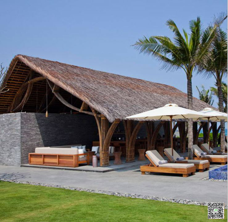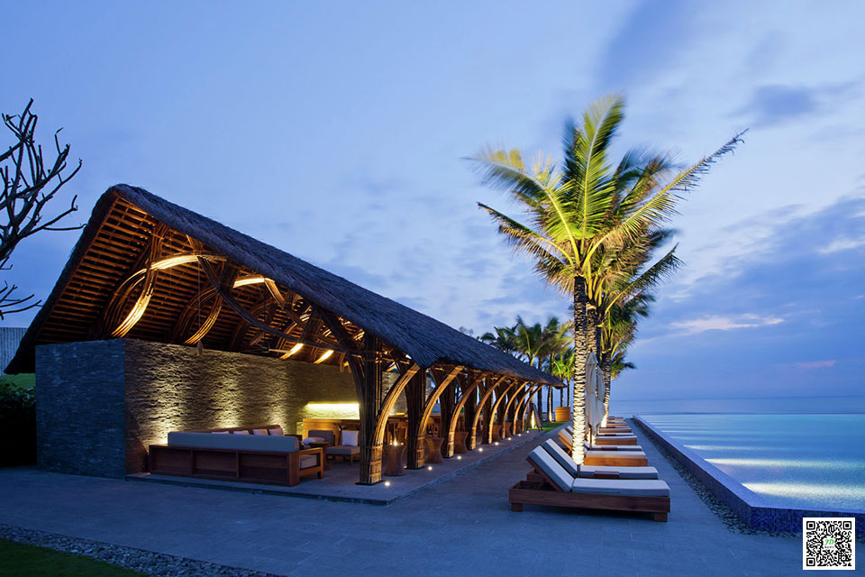 12.越南:纳曼Hay Hay 餐厅 竹建筑 这是由Vo TrongNghia Architects设计的Hay Hay餐厅及酒吧,位于纳曼度假村。这个海滨度假村位于连接岘港市和会安古城之间的主交通要道旁边,距岘港国际机场16公里。海滩竹建筑酒吧位于沙滩旁边,面对着泳池。这个半开放设计的空间提供了一块放松的区域,客人可以在泳池前一边享受饮料一边欣赏前面海滩的风光。特别建造的斜屋顶是一个非常简单的结构,它会吸引人们在餐厅用完餐后回来这里喝上一杯。酒吧是由竹子和石头建成,石头建造的空间主要是服务设施和仓储。