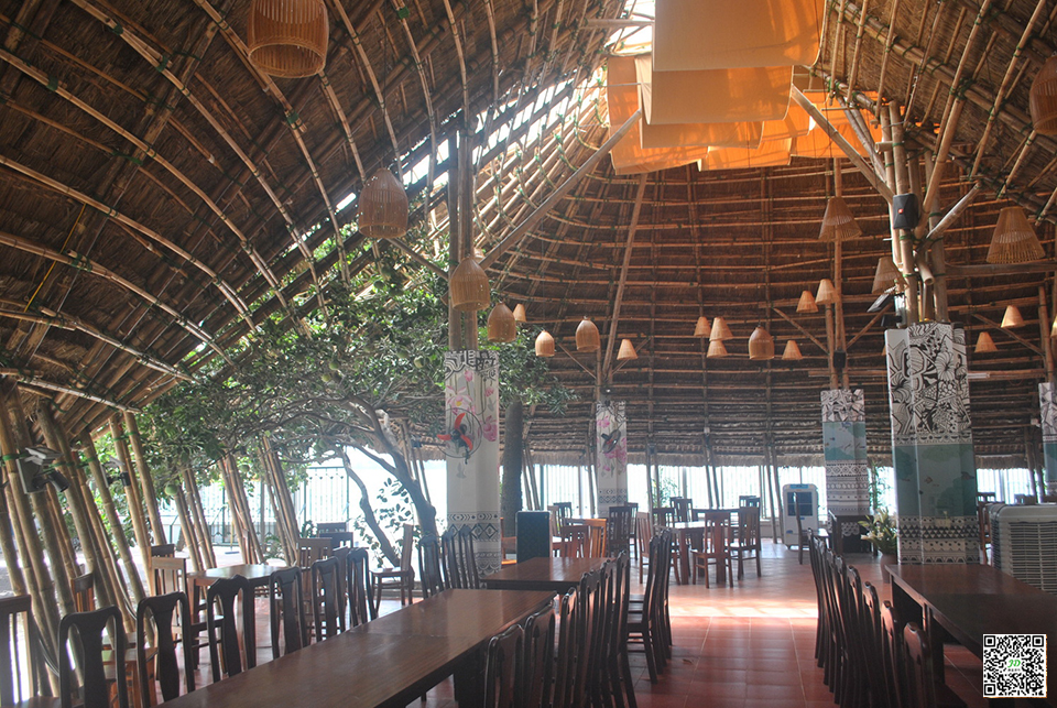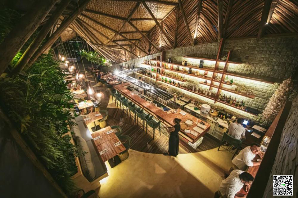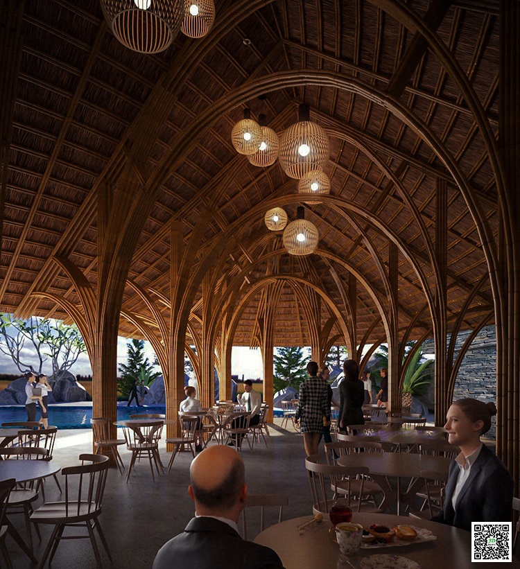 5.越南:特色竹餐厅 竹建筑 烟雾特色竹餐厅被认为是供养仪式的寺庙. 给我们重要能量的健康食物是在几何生活线条下加工和吸收的. 一个有桌子的木制阳台, 接收与现有树木直接接触的食客, 露台的木头体现生命之花的象征。打开了进入室内的门槛, 竹建筑酒吧在一个有瓜多瓦纤维的编织球体内, 与之相比, 这些表格是周边分布的, 遵循具有了解和解释自然结构的叶子形状的线条, 生物测定结构.