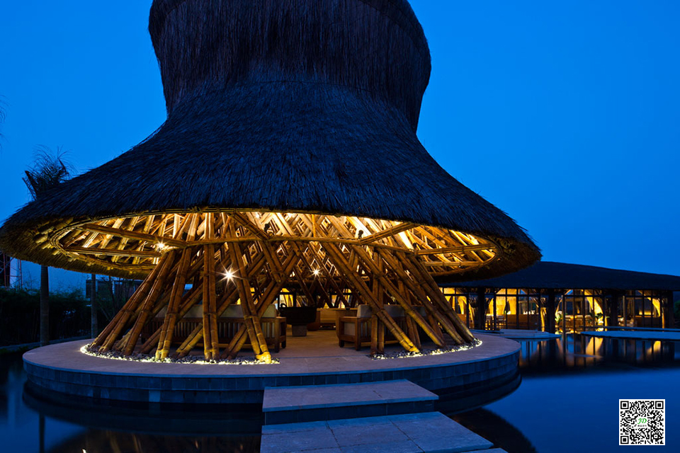 12.越南:竹餐厅 竹景观 这座建筑采用了12边多边形的形状,顶部是茅草屋顶,让人想起越南传统的锥形帽子。 bambubuild利用该场地现有的建筑,利用它支撑竹框架,面积超过700平方米(7,535平方英尺)。这个结构高达15米(50英尺),可以看到餐厅自然环境的全景。结构在地面上组装,然后在起重机的帮助下被抬升到位。被称为’tamvong’,使用的竹子与钢一样坚固,但如果需要则容易弯曲。在屋顶顶篷的中心,最大跨度32米(105英尺),直径1.5米(5英尺)的天窗可引入自然光线。 bambubuild还完成了一个池畔酒吧作为综合体的一部分,其具有类似形态的屋顶遮篷,但采用了不同的竹子构造方法。