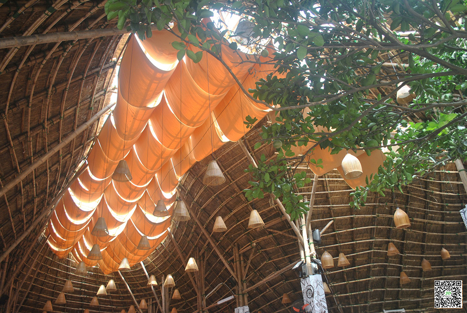 10.越南:TAY HO餐厅 竹建筑 此竹建筑餐厅概念是身体建筑,向内敏感的阳光和由西湖地理特征本身引起的风力结构,并考虑了灵活的体量来适应现场。竹子自然是为了实现一个概念和情况而选择的。5500根6米长的竹子从河内以西100公里的森林距离运到现场,6米也是允许卡车进入城市的最大长度。竹餐厅内部采用特殊的竹结构和带有过滤铰链帆布的天窗。下午 4 点到 6 点左右,一盏可移动的灯在向上的表面屋顶上播放,这是由项目西侧水码头的反射光产生的。竹建筑作为餐厅,鼓励文化活动的平台,丰富了河内西湖当代生活中的历史遗产链。