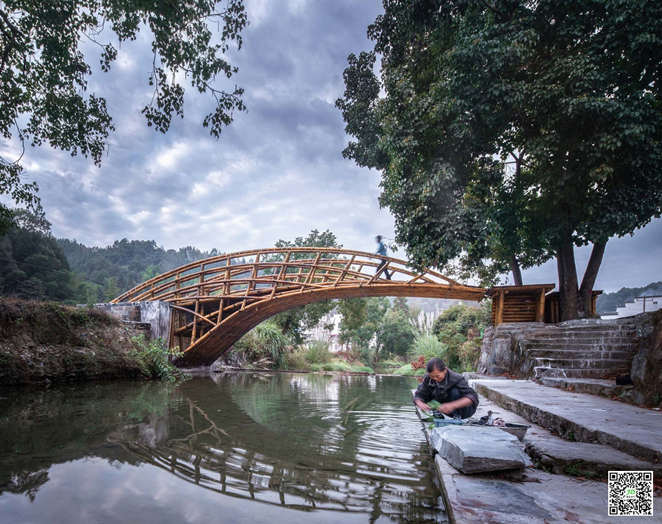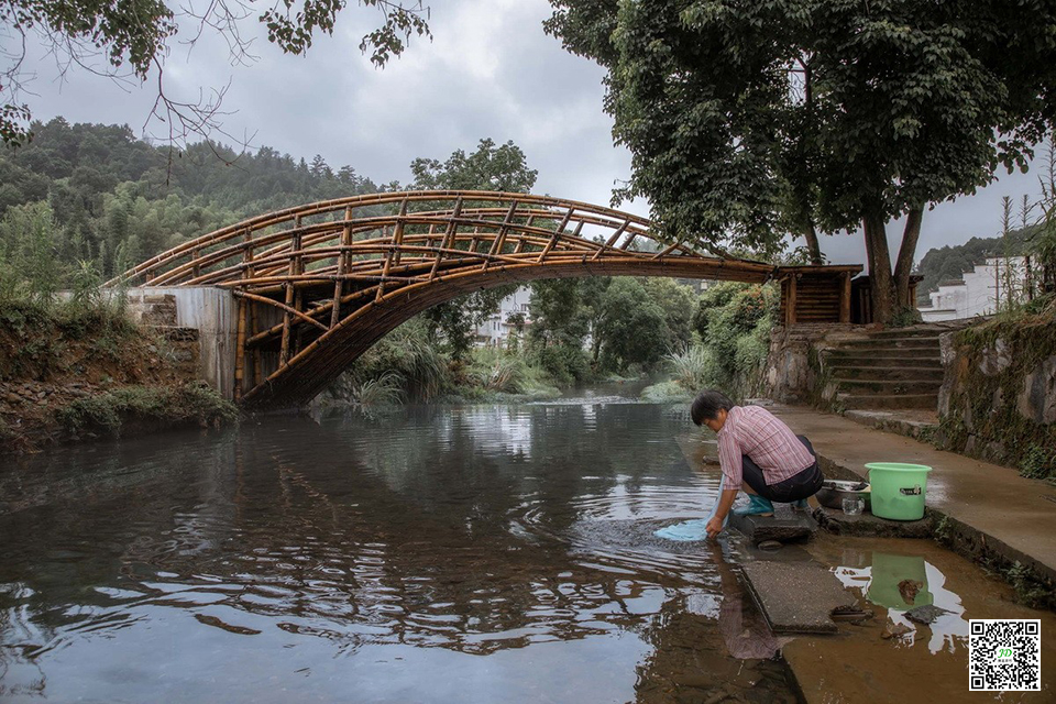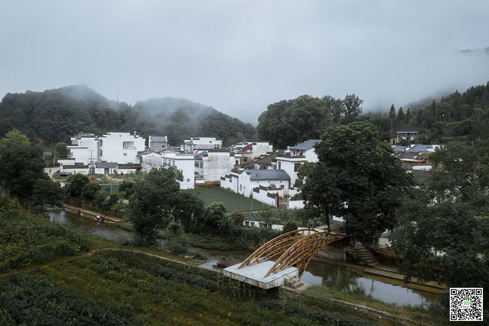 项目的场地位于安徽祁门县桃源村。一条10米宽的水系贯穿村头村尾,阻隔了村落和农田。为了便于村民去田间耕作,需要增加一座人行桥。水系是居住和劳作的分界线,而桥则是通向田园山野的入口。后山上,毛竹密布。用竹子建造,材料本身取之于自然,为人所用,是一种在地的营造。